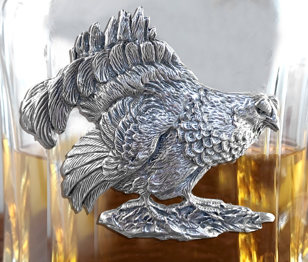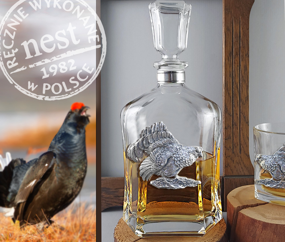 Cietrzew, rzadko występujący gatunek w polskich lasach, został uwieczniony w postaci autorskiej płaskorzeźby na naszej niepowtarzalnej karafce Nest. Jest to wyjątkowa karafka do whisky, wódki lub nalewek własnej produkcji. Aplikację cietrzewia wykonaliśmy ręcznie, z brązu pokrytego srebrem. Szczelny korek to dodatkowy walor karafki. Polecamy jako prezent dla leśnika, myśliwego lub miłośnika polskiej przyrody.