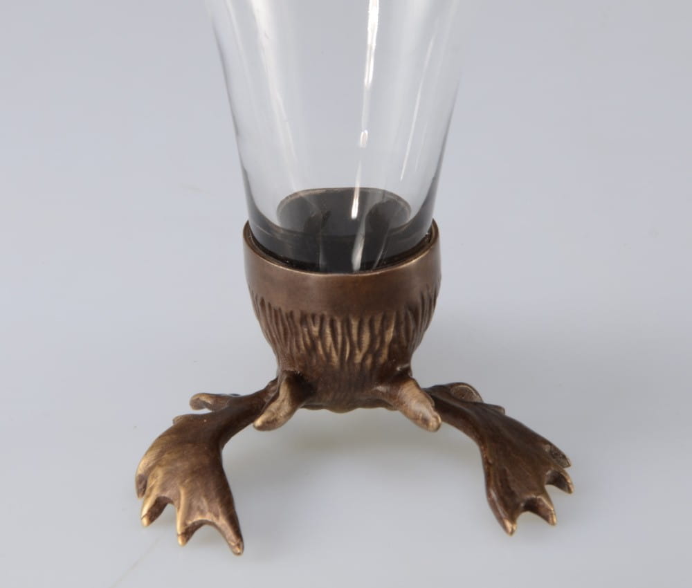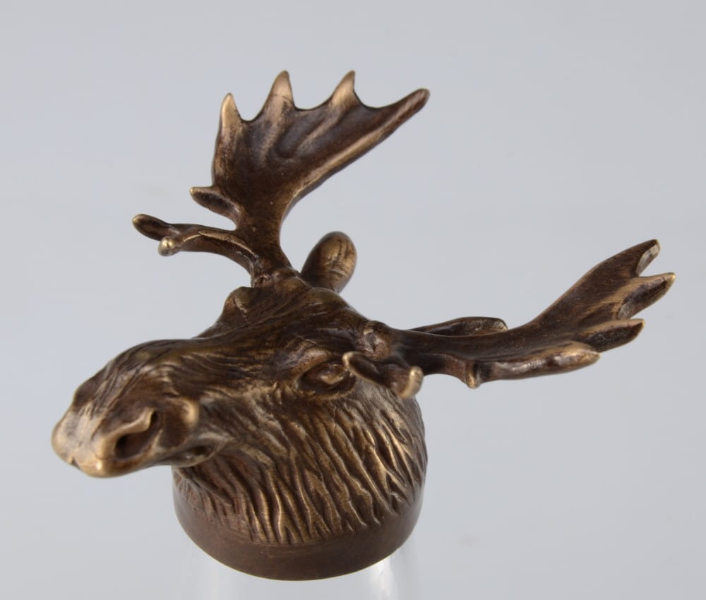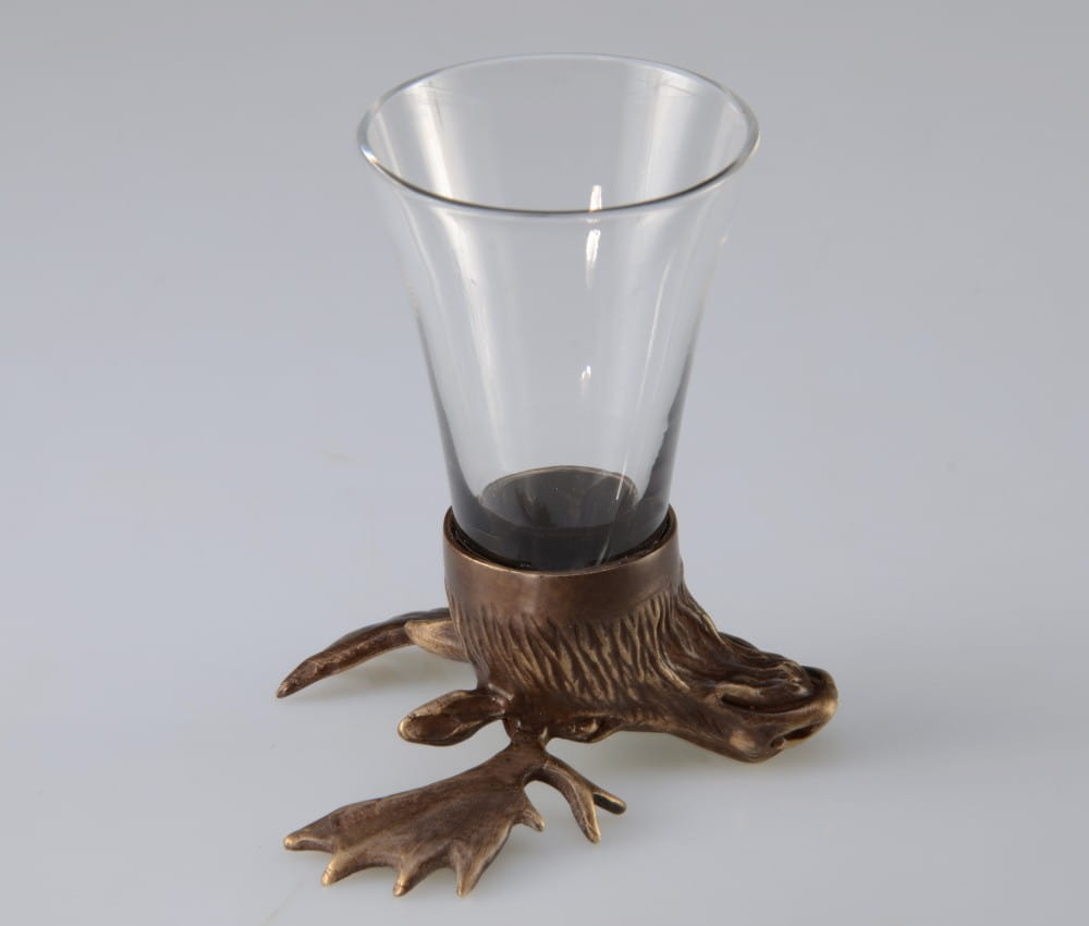 Kieliszek do wódki lub nalewki ozdobiony rzeźbiarską głową łosia - wyjątkowy prezent dla myśliwego, leśnika oraz każdego miłośnika przyrody.
