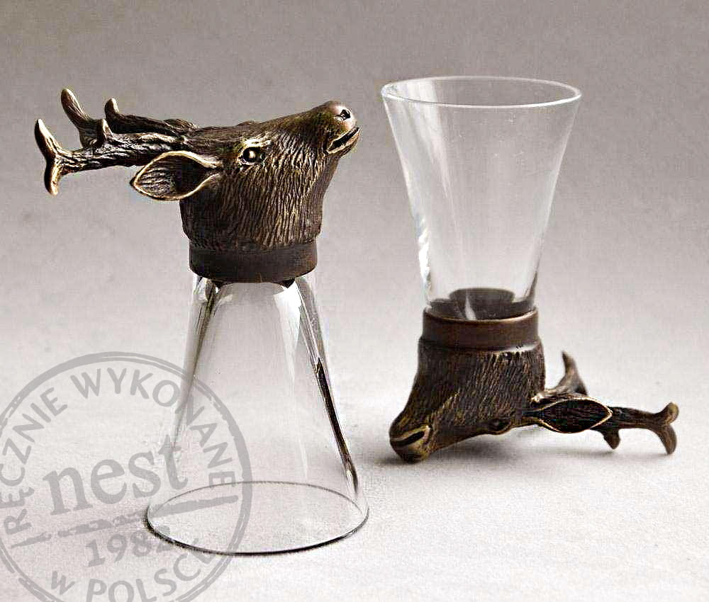 Tradycja myśliwska od lat inspiruje nas do tworzenia pięknych, a jednocześnie użytecznych przedmiotów. Jednym z nich jest kieliszek myśliwski, w którym szkło oprawiliśmy w rzeźbę z brązu w kształcie głowy koziołka. Doskonały do wódki lub nalewek, jest atrakcyjną ozdobą stołu, a podarowany jako prezent - oryginalną myśliwską pamiątką. Wspaniale zaprezentuje się zwłaszcza w towarzystwie naszych kieliszków z głowami innych zwierząt z polskich lasów.