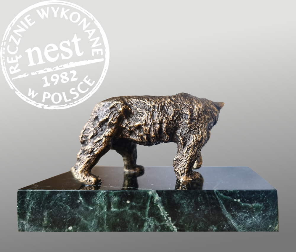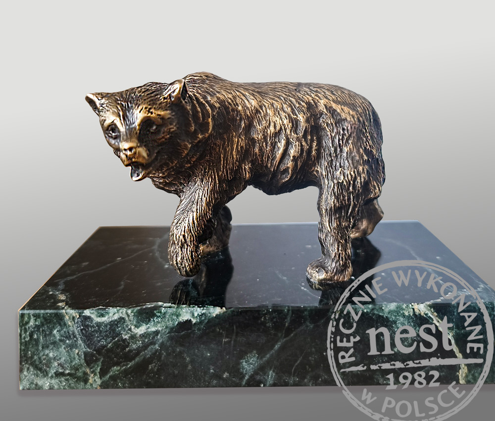 Niedźwiedź na marmurze to rzeźba, którą wykonaliśmy z brązu, nadając jej atrakcyjną, a jednocześnie elegancką formę, idealną, by w niebanalny sposób ozdobić pokój myśliwego. Na rzeźbie doskonale zaprezentuje się tabliczka z okolicznościowym grawerunkiem, który uczyni z figurki doskonały, spersonalizowany podarunek.