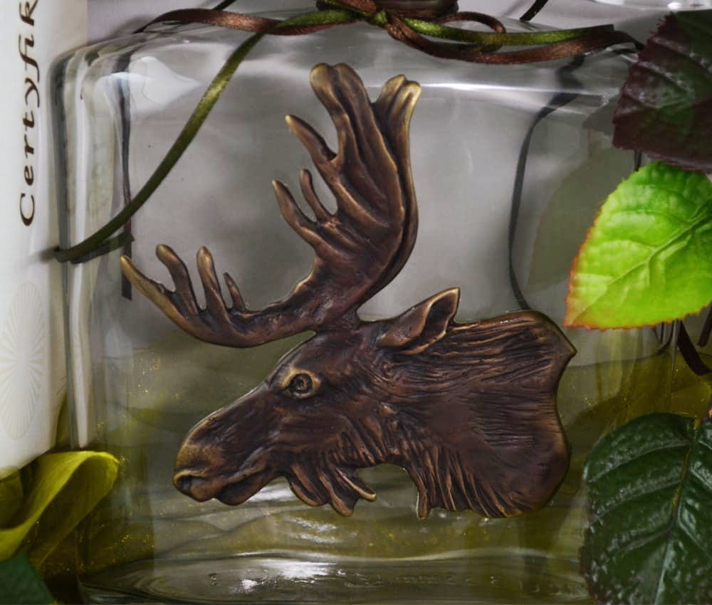 Elegancki zestaw prezentowy: karafka oraz dwa kieliszki z motywem łosia zaprezentowane w dekoracyjnym zestawie. Szklaną karafkę oraz kieliszki oprawiliśmy w rzeźbione zdobienia z brązu. To eleganckie połączenie sprawia, że zestaw jest prezentem wyjątkowym. Karafka idealna do wódki, nalewki lub innych alkoholi, posiada szczelny korek.