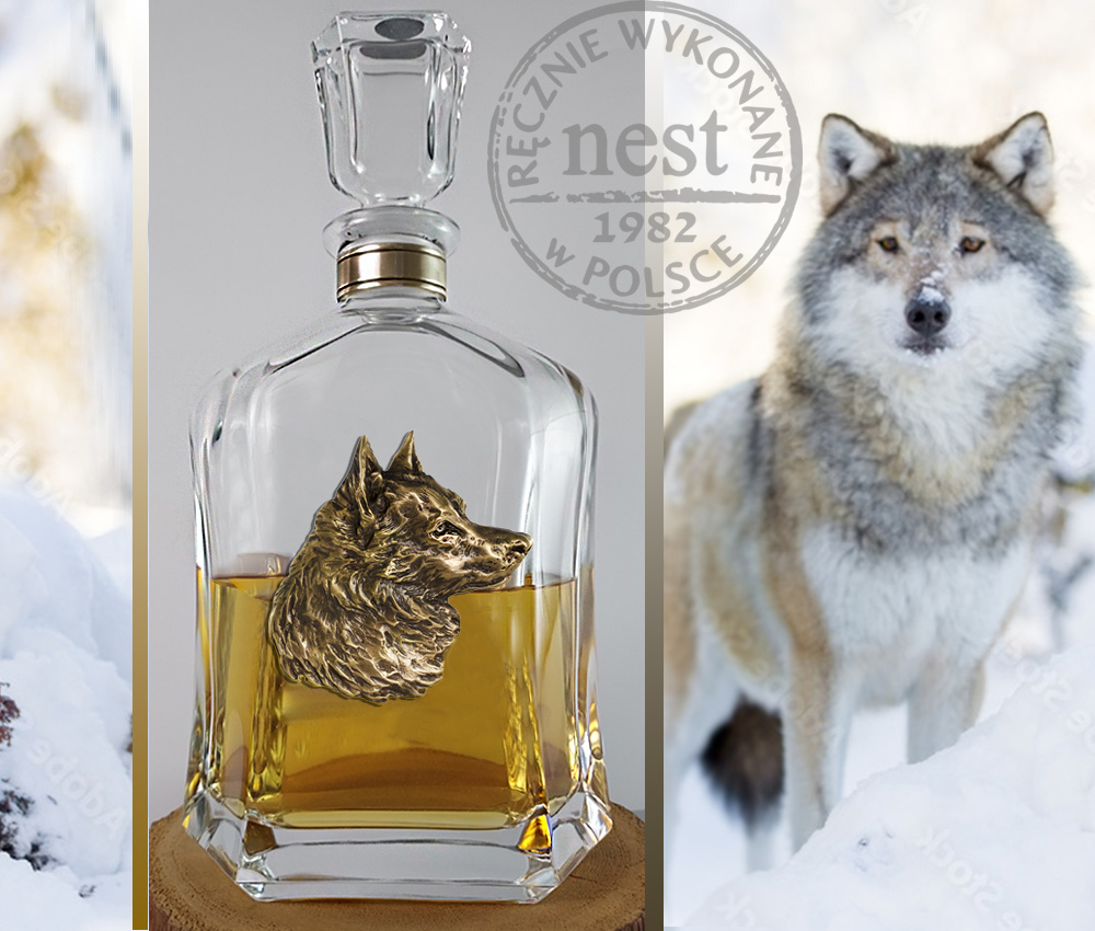 Elegancka ręcznie wykonana karafka do whisky, wódki lub nalewki. Aplikacja z brązu w formie autorskiej rzeźby głowy wilka nawiązuje do symbolu zwierzęcia wielkiej mocy. Polecamy jako znakomity prezent dla myśliwego, leśnika i każdego miłośnika tych magicznych zwierząt.