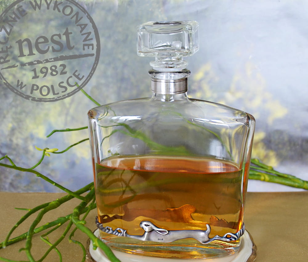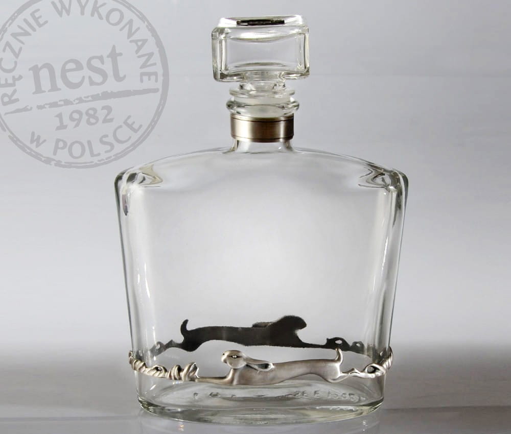 Nasze karafki to przedmioty luksusowe i unikatowe, produkowane w krótkich seriach na podstawie autorskich wzorów. Karafkę ze szkła ozdobiliśmy myśliwskim motywem zajęcy wykonanym z posrebrzanego brązu.