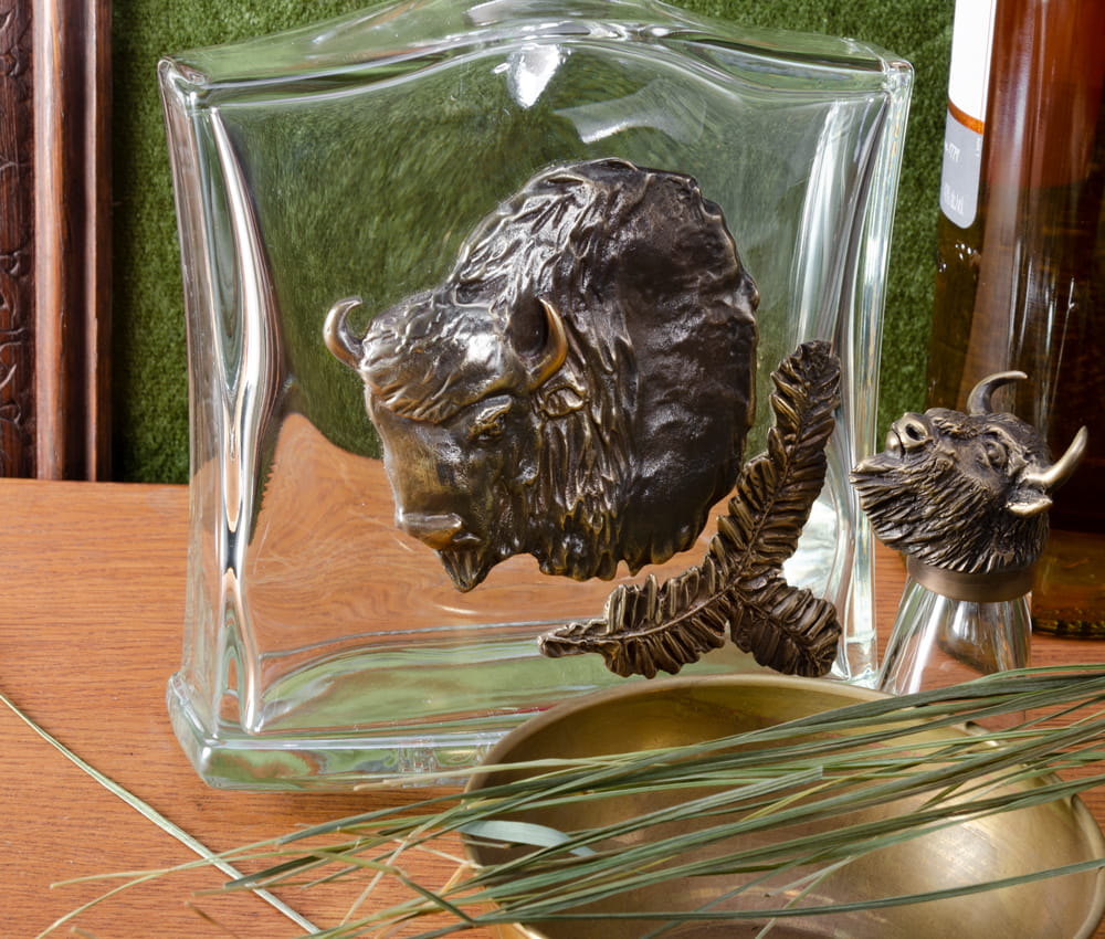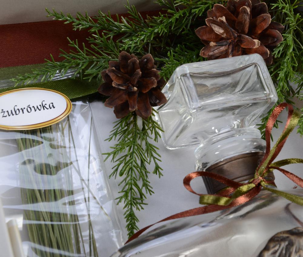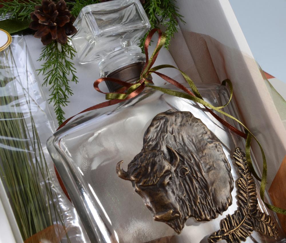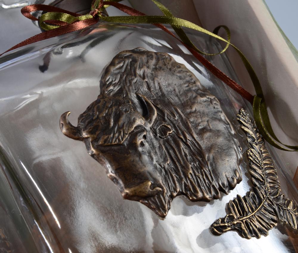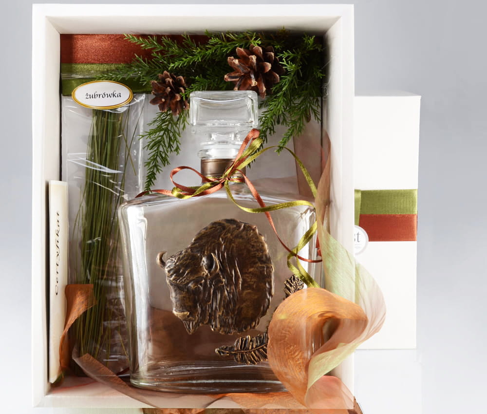 Oryginalny zestaw prezentowy dla myśliwego - karafka z aplikacją w formie żubra z trawą żubrówką. Każdy obdarowany będzie mógł przygotować samodzielnie słynną nalewkę. Karafka jest wykonana ze szkła i ozdobiona rzeźbą żubra z brązu. Posiada szczelny korek.