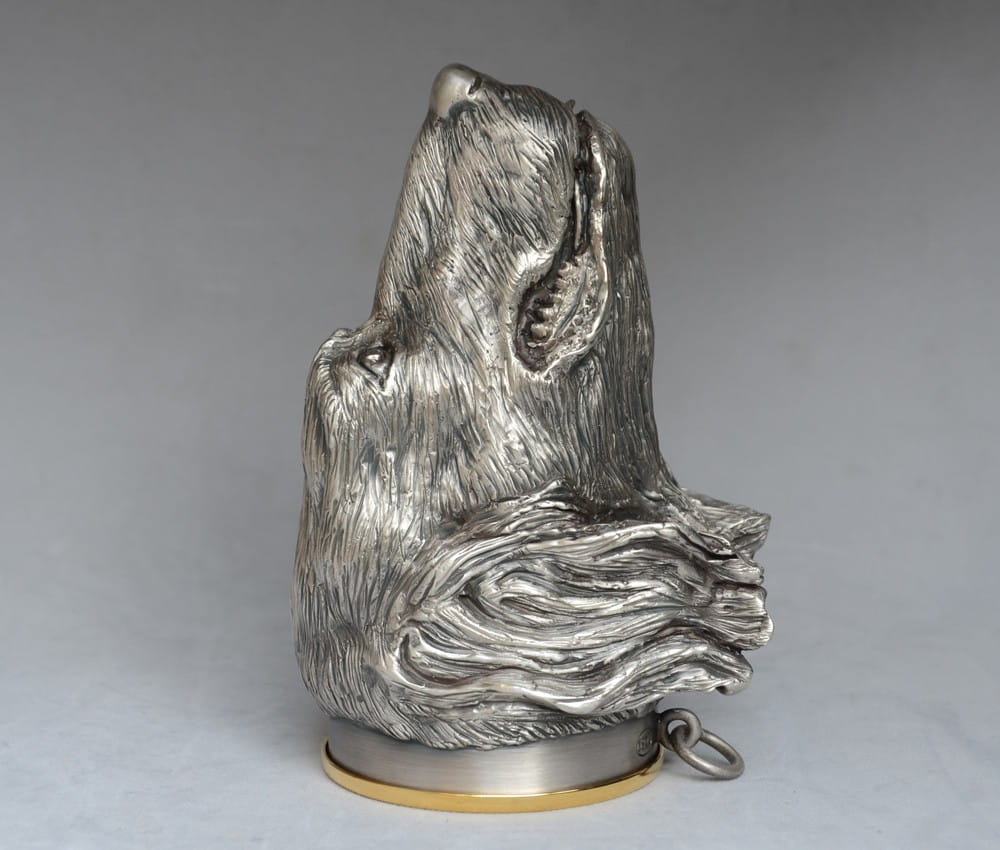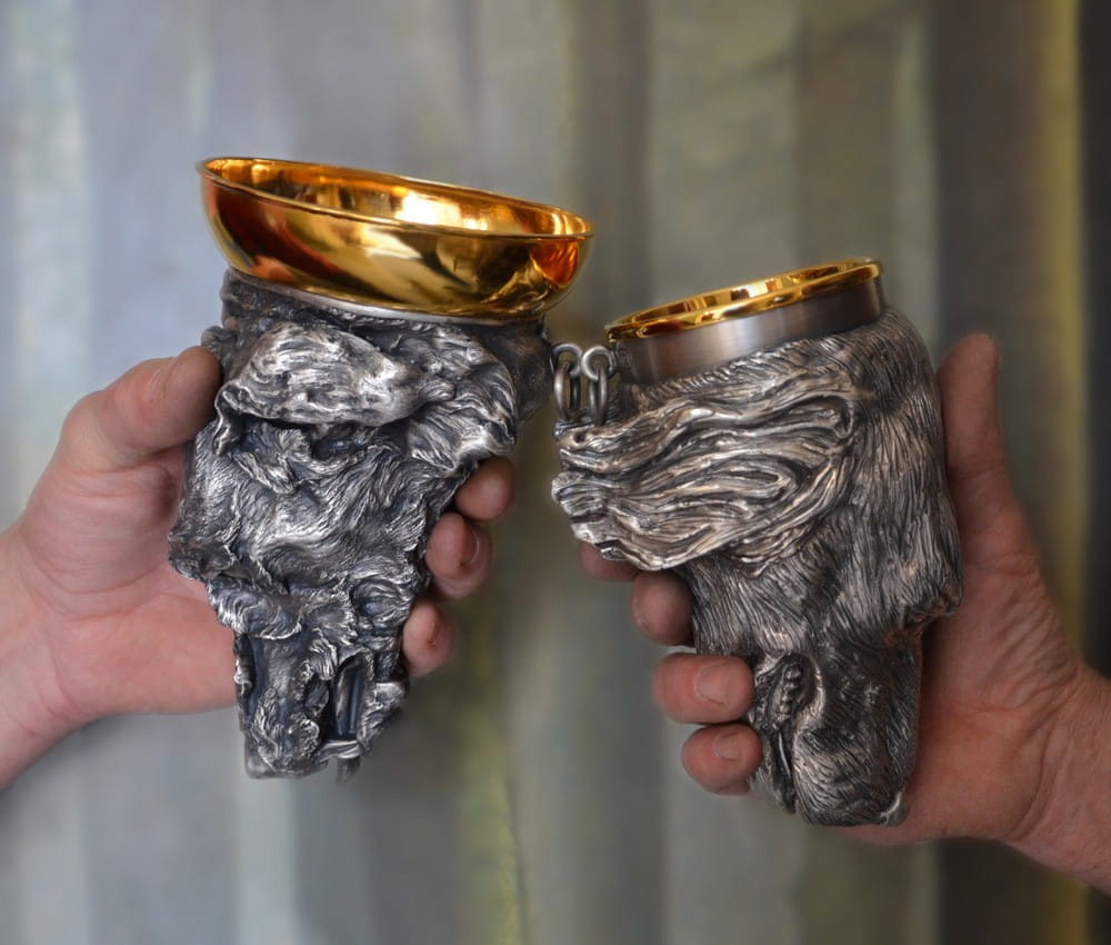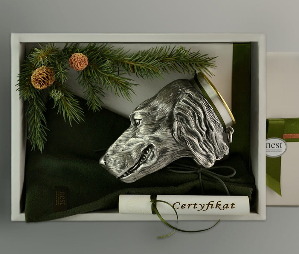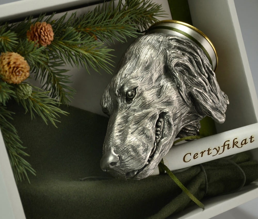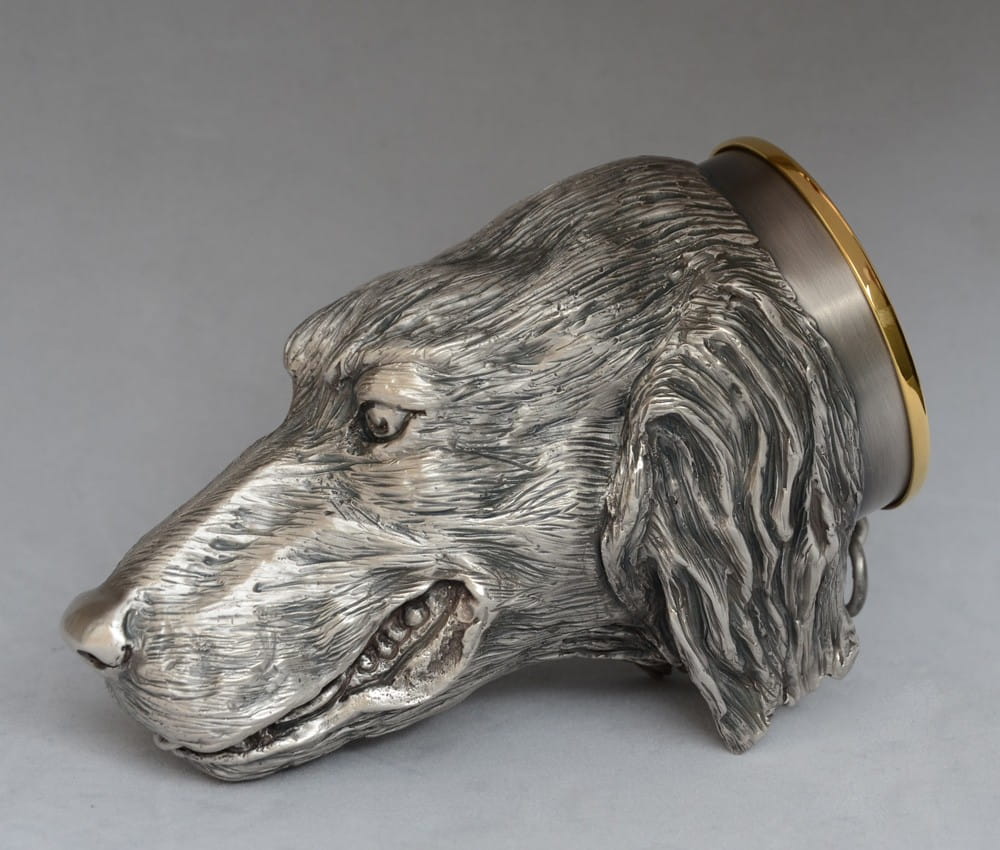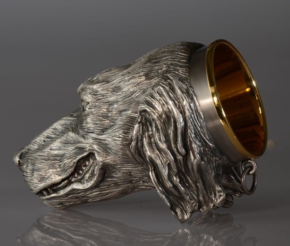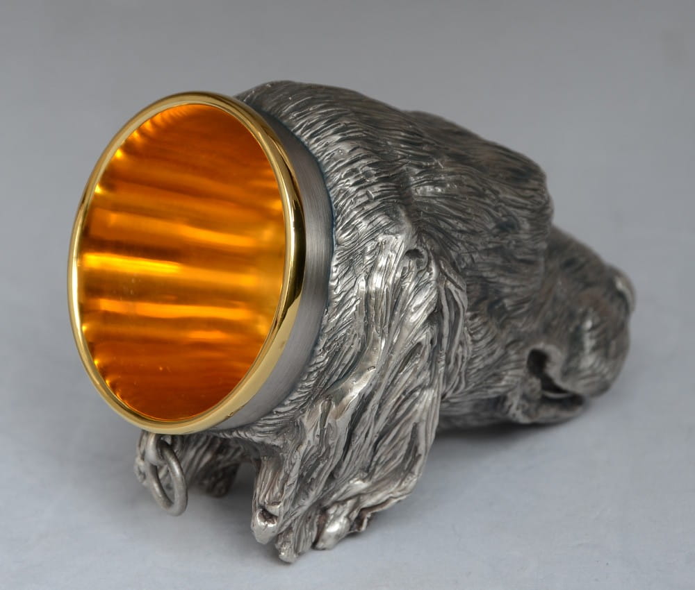 Wśród myśliwych z pewnością znajdą się amatorzy piwa i to właśnie z myślą o nich stworzyliśmy artystyczną, dużą kulawkę, której nadaliśmy kształt głowy myśliwskiego psa. Wykonana ze srebrzonego brązu, a w środku pokryta 24 karatowym złotem, dzięki czemu jest nie tylko oryginalną alternatywą dla zwykłego kufla, ale i ekskluzywnym przedmiotem, idealnym na prezent dla myśliwego lub miłośnika zwierząt.