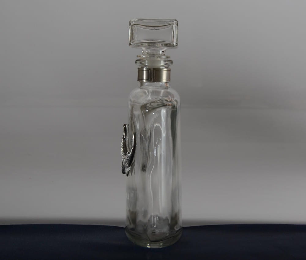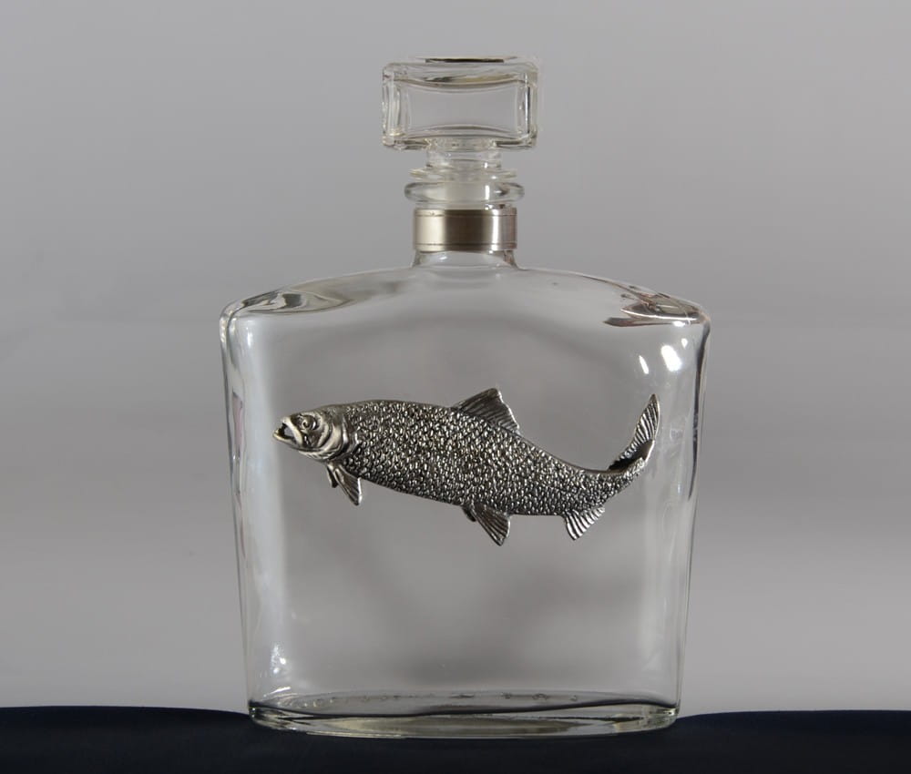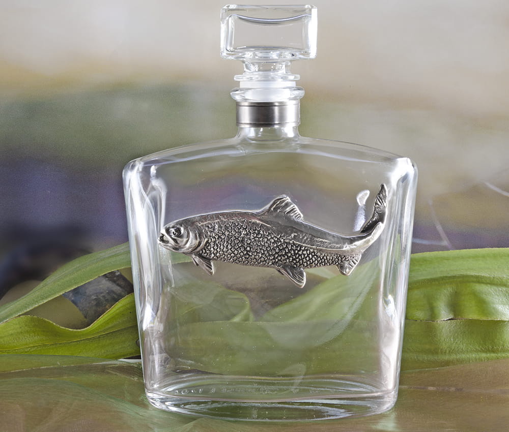 Karafka z łososiem to znakomity prezent dla wędkarzy, którzy marzą o wyprawie na połów łososia. Tym, którzy w takich eksytujących połowach już uczestniczyli, sprawi wiele radości i przywoła wspomnienia wędkarskich sukcesów.Aplikacja łososia wykona została przez nas z brązu pokrytego srebrem. Jest ona oksydowana i zabezpieczona przed ciemnieniem. Szklana karafka o kształcie nawiązującym do piersiówki, doskonale nadaje się do podawania mocniejszych alkoholi.