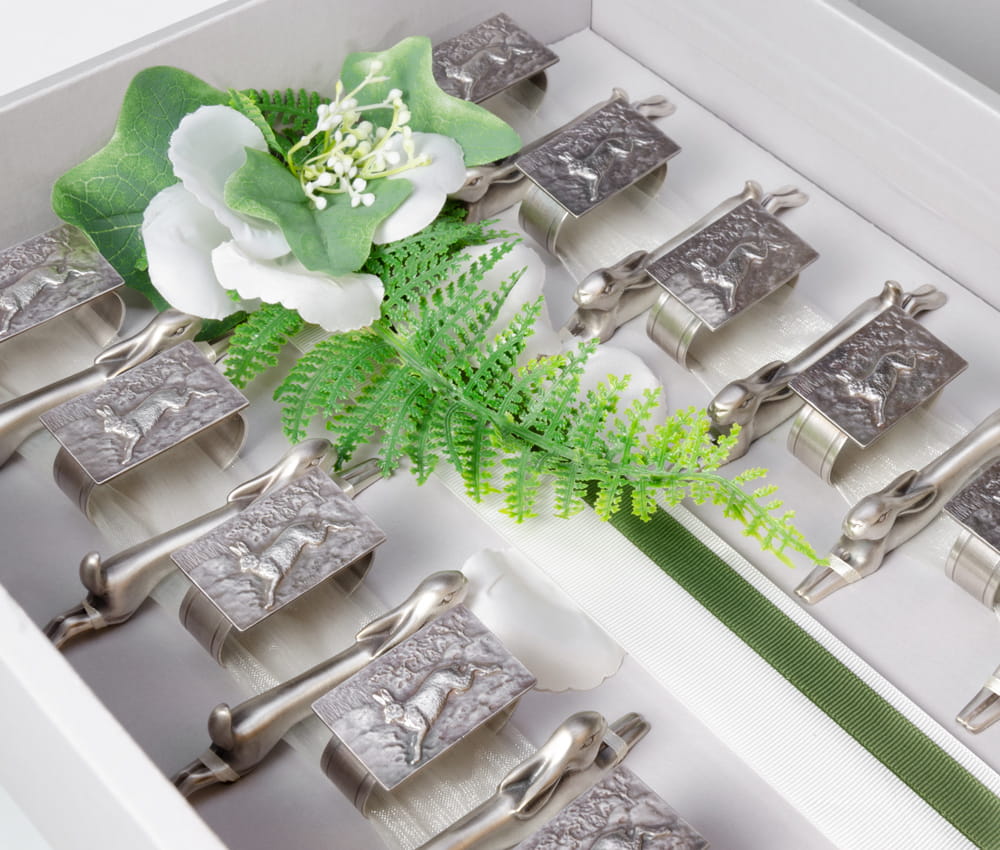 Elegancki zestaw prezentowy do dekoracji myśliwskiego stołu - serwetniki i koziołki pod sztućce. Ręcznie wykonane koziołki w kształcie stylizowanych sylwetek zajęcy oraz serwetniki ozdobione podobnym motywem przygotowaliśmy z brązu pokrytego srebrem. Będą one doskonałym prezentem dla Diany, prezentem ślubnym lub na Wielkanoc.
