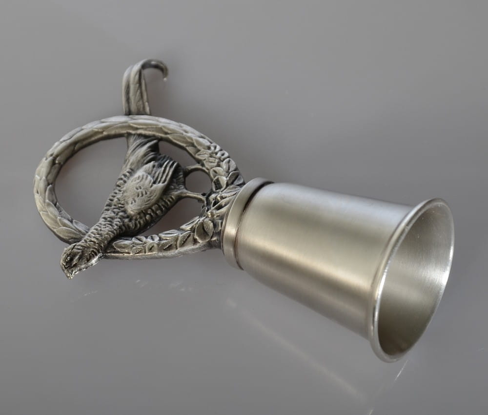 Myśliwski kieliszek z brązu pokrytego najwyższej próby srebrem ozdobiliśmy rzeźbą bażanta w wieńcu, która nadaje kulawce piękną artystyczną formę inspirowaną naturą. Kupiona na prezent dla amatorów myślistwa bez wątpienia sprawi mnóstwo radość i będzie służyć podczas polowań, jednocześnie zdobiąc i symbolizując udane łowy. Perfekcyjne wykonanie czyni z niej wartościowy przedmiot kolekcjonerski.
