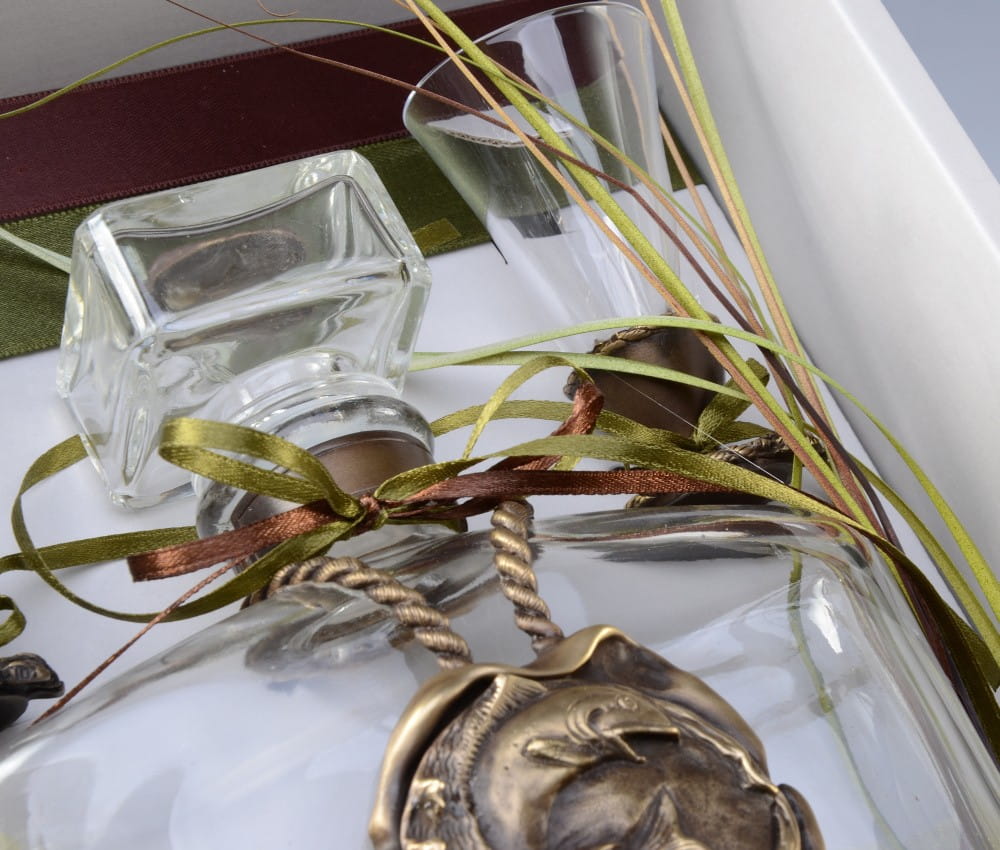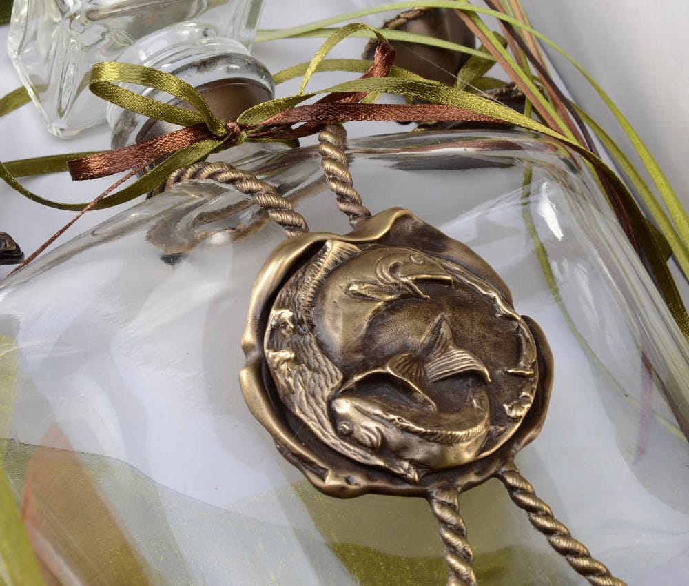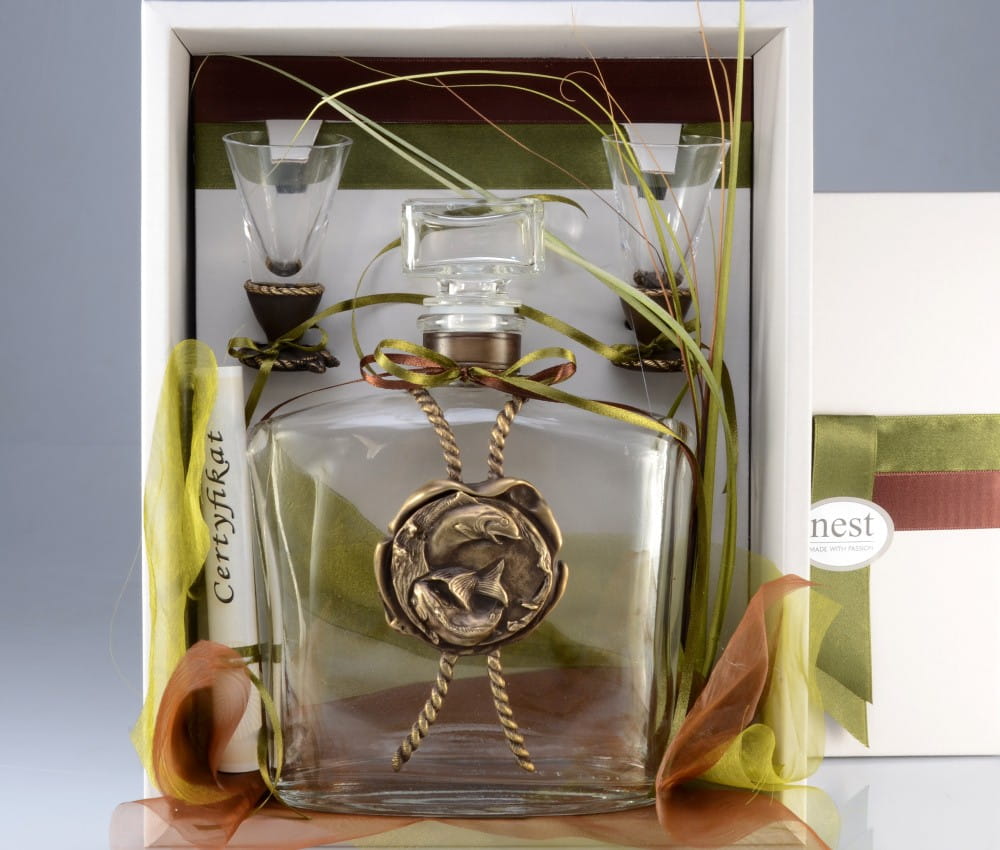 Zestaw prezentowy - karafka z dwoma kieliszkami, które szczególnie przypadną do gustu miłośnikom wędkarstwa. Karafkę zdobi motyw pieczęci z płaskorzeźbionymi rybami. Kieliszki są oprawione w podstawy z motywem sznurka.