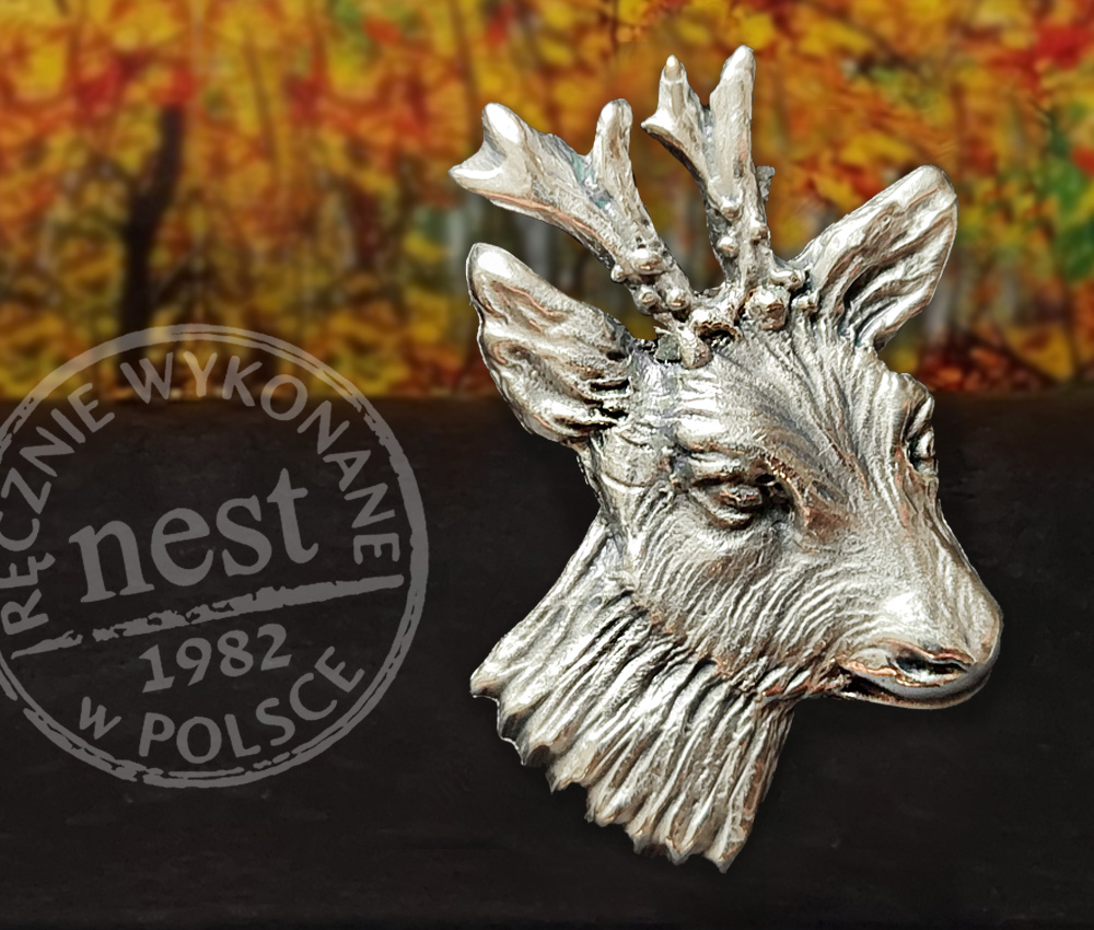 Posrebrzana przypinka do klapy marynarki lub kapelusza z motywem głowy koziołka. Doskonała jako upominek dla myśliwego, leśnika lub miłośnika natury.