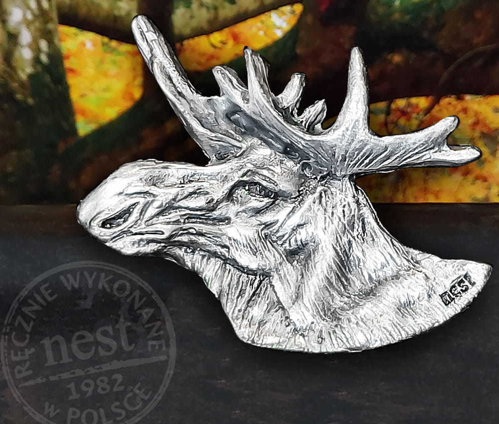Posrebrzana przypinka do klapy marynarki lub kapelusza z motywem głowy łosia. Doskonała jako upominek dla myśliwego, leśnika lub miłośnika natury.