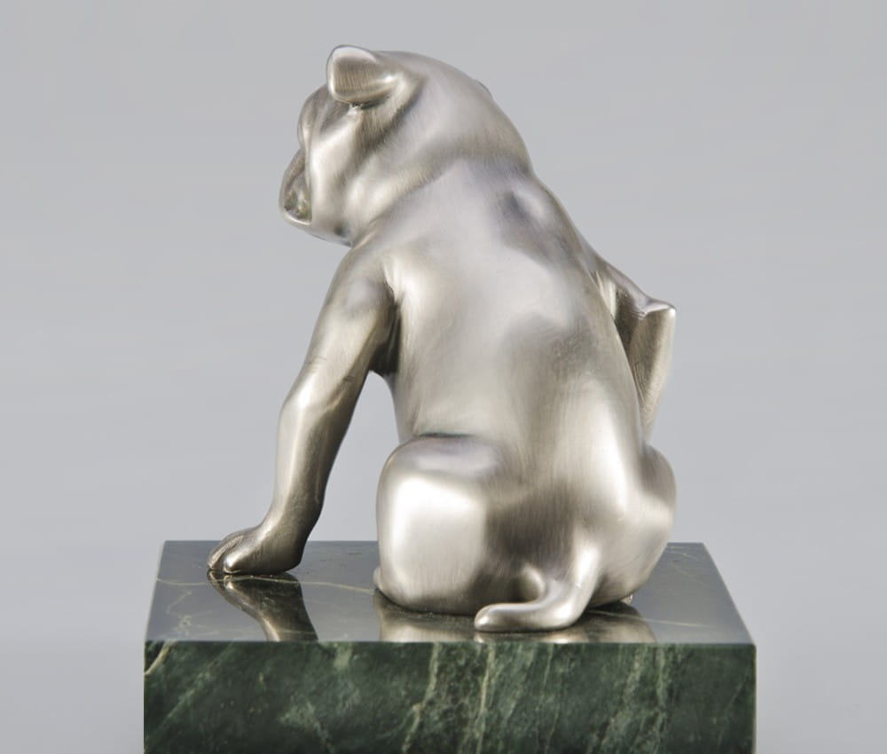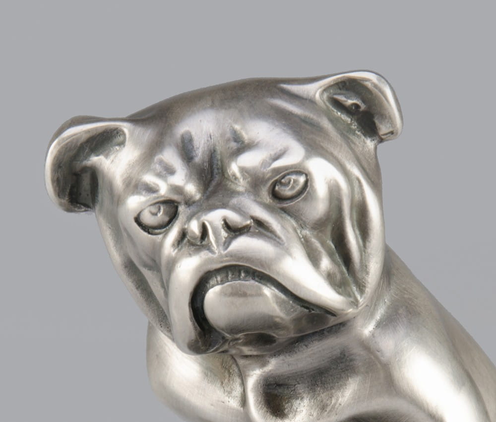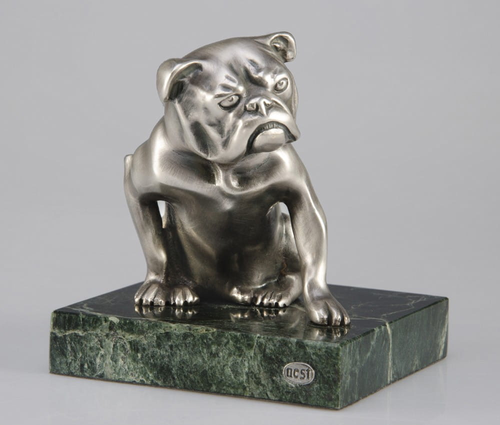 Rzeźba psa rasy buldog - wykonana z brązu pokrytego srebrem na marmurowej podstawie. Elegancka ozdoba biura, czy gabinetu, która przypadnie do gustu każdemu wielbicielowi psów.