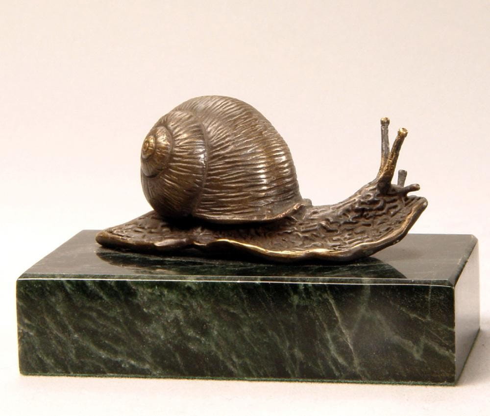 Rzeźba ślimaka wykonana z brązu na podstawie z zielonego marmuru.