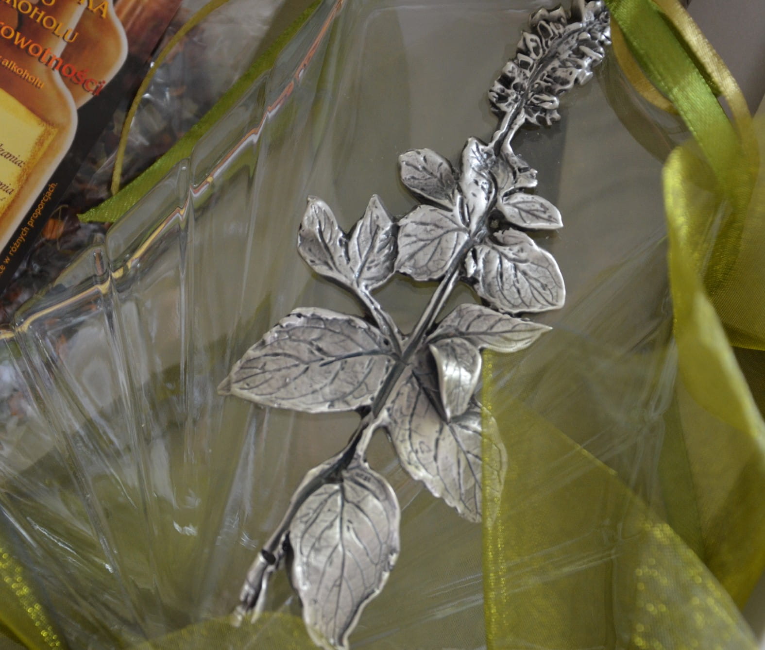 Zestaw prezentowy z karafką do nalewek. Wyśmienity prezent, który szczególną radość sprawi osobom samodzielnie wytwarzającym nalewki lub inne mocne trunki. Karafka z ozdobną aplikacja kwiatu mięty oraz zaprawką do alkoholu. Karafka została wykonana ze szkła i ozdobiona płaskorzeźbą z brązu pokrytego srebrem najwyższej próby. Szczelny korek.